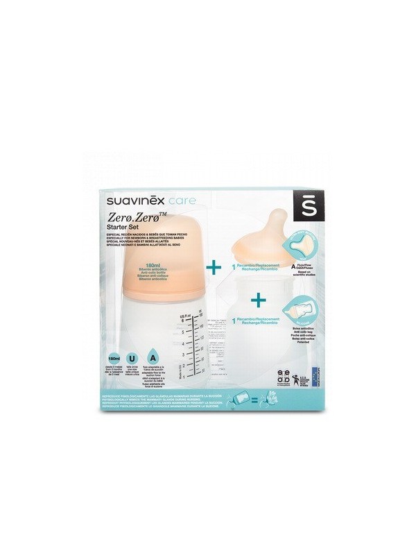 Pack Especial para Recién Nacidos Zero. Zero es el conjunto ideal para padres que buscan una solución efectiva y cómoda para la alimentación de sus bebés. Incluye un biberón anticólicos de 180 ml con tetina de flujo adaptable, una tetina de recambio y una bolsa anticólicos de recambio.