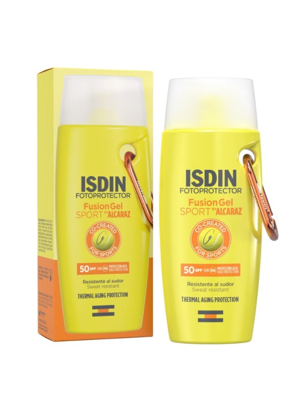 Isdin fotoprotector fusion gel sport alcaraz spf50 100ml es un fotoprotector corporal en formato gel contra los rayos uvb y uva y spf (factor de protección solar) 50. Elaborado a base de ginger cell protect que favorece la protección de la piel frente al daño oxidativo provocado por la acción solar. Además, es ultraligero y deja un efecto refrescante, es resistente al agua y al sudor. Su fórmula es wet skin que permite la aplicación en piel húmeda sin dejar residuo blanco. Apto para piel atópica y sensible. Testado dermatológicamente. Testado en deportes de alta intensidad.