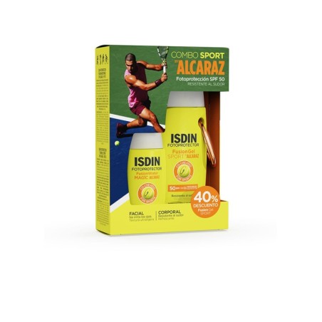 Combo sport by alcaraz rostro y cuerpo spf50 en estuche de 2 piezas de isdin. Este protector solar está especialmente formulado para los amantes de los deportes. Es ultraligero, ofrece un efecto refrescante y proporciona una alta protección solar con fps 50 contra los rayos uvb y uva. Presenta una extraordinaria resistencia al agua y al sudor, lo que lo hace perfecto para aplicar incluso sobre la piel húmeda. Se absorbe de manera inmediata sin dejar residuos, está libre de aceites minerales y es seguro para pieles atópicas y sensibles. El producto ha sido evaluado dermatológicamente y probado en situaciones deportivas exigentes. El set contiene: protector solar facial spf50 de 50 ml y protector solar corporal spf50 de 100 ml. Contenido: 2 piezas.